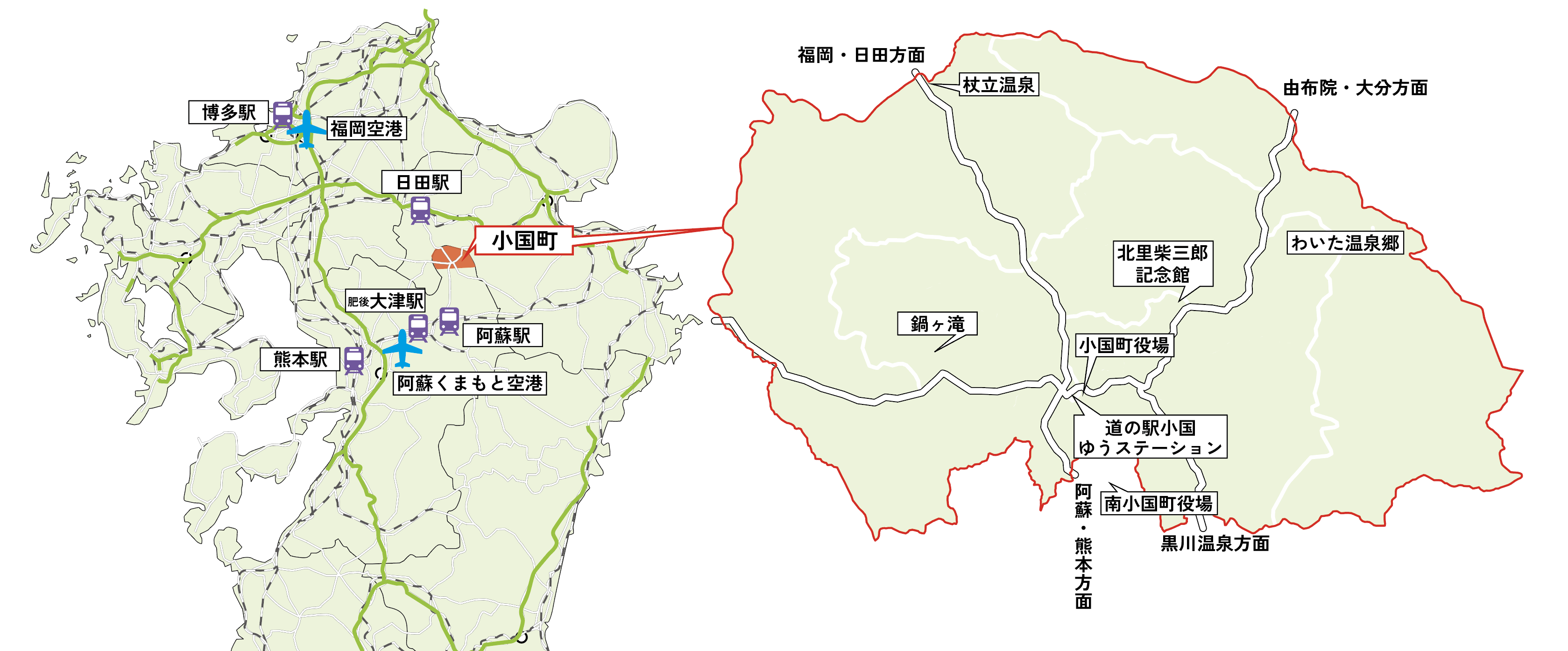 九州のほぼ中央、熊本県の最北端、阿蘇外輪山の外側にあり筑後川の上流に位置しています。東西北部を大分県、南部を南小国町と隣接し、東西18キロメートル南北11キロメートル総面積136.72平方キロメートルで総面積の74%は山林が占めた農山村地域です。
